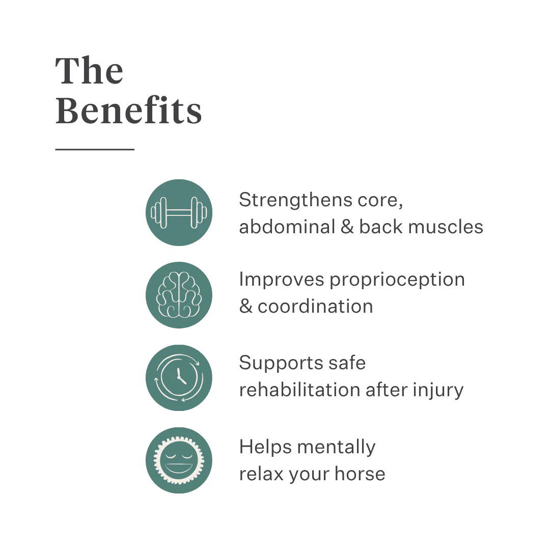 Developed by two European veterinary experts in sports medicine, the compact and lightly springy pads create a gentle instability that forces your horse’s body into continuous micro-corrections. This keeps the deep postural and stabilization muscles active : building strength, improving balance, and supporting overall wellbeing in just a few minutes a day.