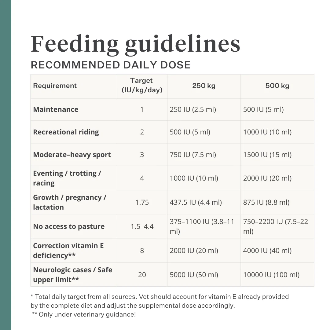 Vet-formulated natural vitamin E oil for horses needing highly bioavailable daily support for muscle function, nerve health and antioxidant protection.